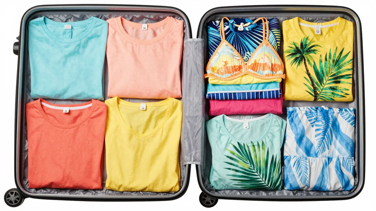 옷 부피를 줄이는 최고의 발명품은 **'여행용 압축팩'**입니다. 청소기로 빨아들이는 것 말고, 손으로 돌돌 말아서 공기를 빼는 방식을 사세요. (청소기가 없는 숙소도 많으니까요.)
